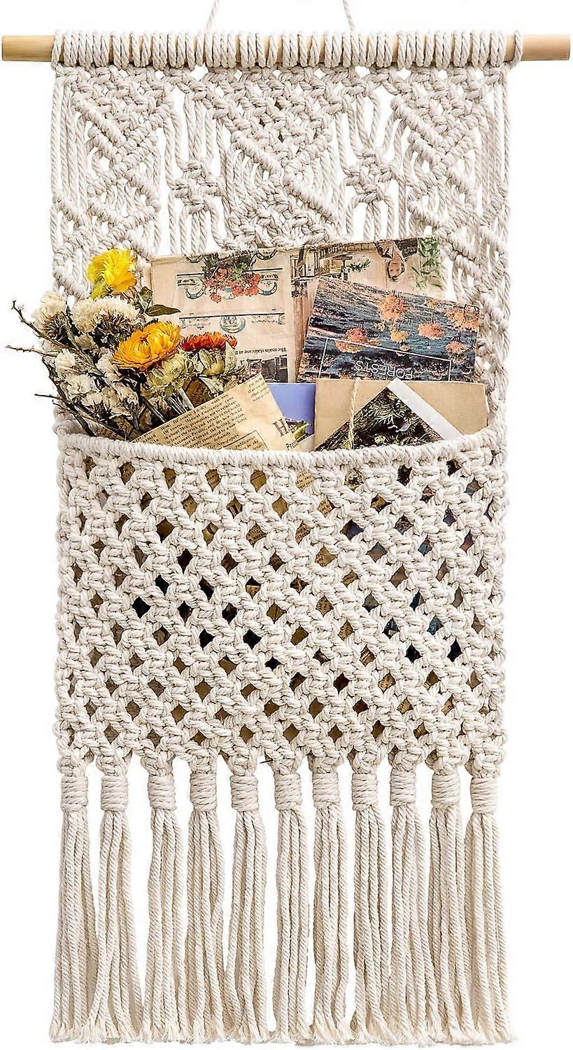 Magazine Storage Organizer Mail Holder Wall Mount Cotton Wovening Hanging Pocket,Boho Home Decor, Ivory