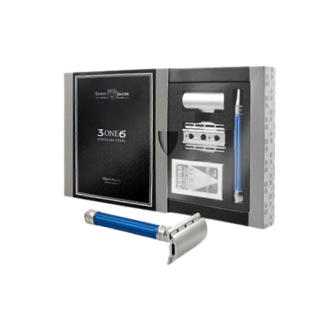 Coffret Rasoir De Sécurité En Acier Inoxydable à Double Tranchant Rainuré Bleu Anodisé + Paquet De Lames De Rasoir Feather