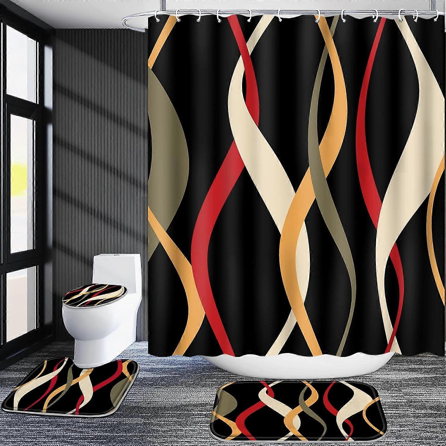 4PCS Shower Curtain Set Black Stripe Bath Mat U Shape Toilet Cover Rugs & 12 Hooks for Bathroom Decor