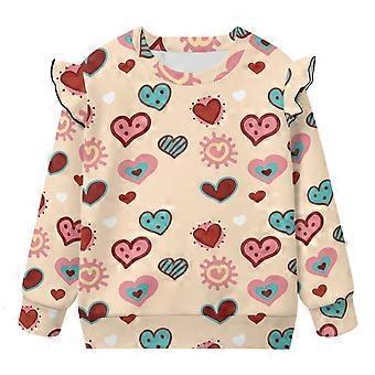 Sweatshirt mit Herzchenmuster und Rüschen an den Schultern für Kleinkinder, Langarm-Pullover für 3T-4T, Herbst-/Frühlingsbekleidung