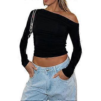 Damen One-Shoulder Langarm Cropped Top Geraffte Reine Farbe Asymmetrische Slim Fit T-Shirt