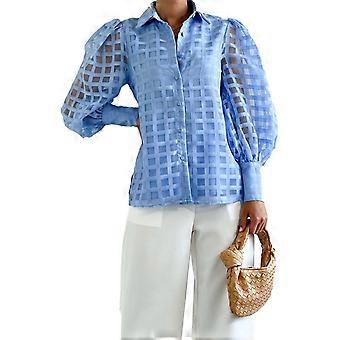 Frauen Kariertes Hemd Durchsichtige Laterne Langarm Umlegekragen Knopfleiste Reine Farbe Bluse