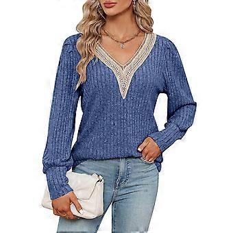 Damen Spitzenbesatz V-Ausschnitt Rippstrick Top Casual Dressy Loose Fit Langarm Pullover Shirt