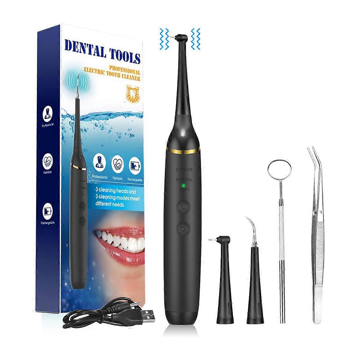 Electric Ultrasonic Tartar Remover, Tartar Remover, Tooth Scraper, Tooth Cleaner.Let us introduce you to our electric tooth remover.The scope of delivery includes 3 cleaning heads: 1 needle-shaped cleaning head, 1 hook-shaped cleaning head and 1 flat cleaning head, which do the cleaning and polishing.It also has 3 cleaning modes to meet different needs.Furthermore, its compact design and intuitive operation make this device a perfect oral care device for you and your family.FeaturesVersatile: 3 cleaning heads and 3 cleaning modes to meet different needsReliable: The stainless steel steel tip and waterproof housing guarantee safety: The LED additional light helps to precisely remove tartar or stains.Environmentally friendly: The rechargeable 250mAh battery offers long autonomy.The lightweight housing and silicone handle ensure a good grip.How to use?1. Select and install a suitable cleaning head.2.Clean the working tip with running water or alcohol.3.Press the power button to turn on the device.LED light turns on automatically.4.Press the mode button to select a mode.5.Look in a mirror and apply the working tip to the required area of your teeth to remove tartar or stains.6.After use, press the power button to turn off the device.Gargle with plain water.7.Rinse the cleaning head under running water.Notes1.The device is intended exclusively for cleaning teeth.2.It is recommended to start with Soft mode.3.Keep it away from children.Technical data: Name: Electric tooth cleaner.Battery capacity: 250mAhCharging mode: Waterproof: IPX6.Dental mirror1* Tweezers1* DC charging cable1* Instruction manual.