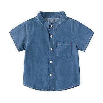 AWZXDE Boys Denim Short Sleeve Stand Collar Casual Top Boys Dress Shirts For Summer Fashion Dark Blue 4-5 Years