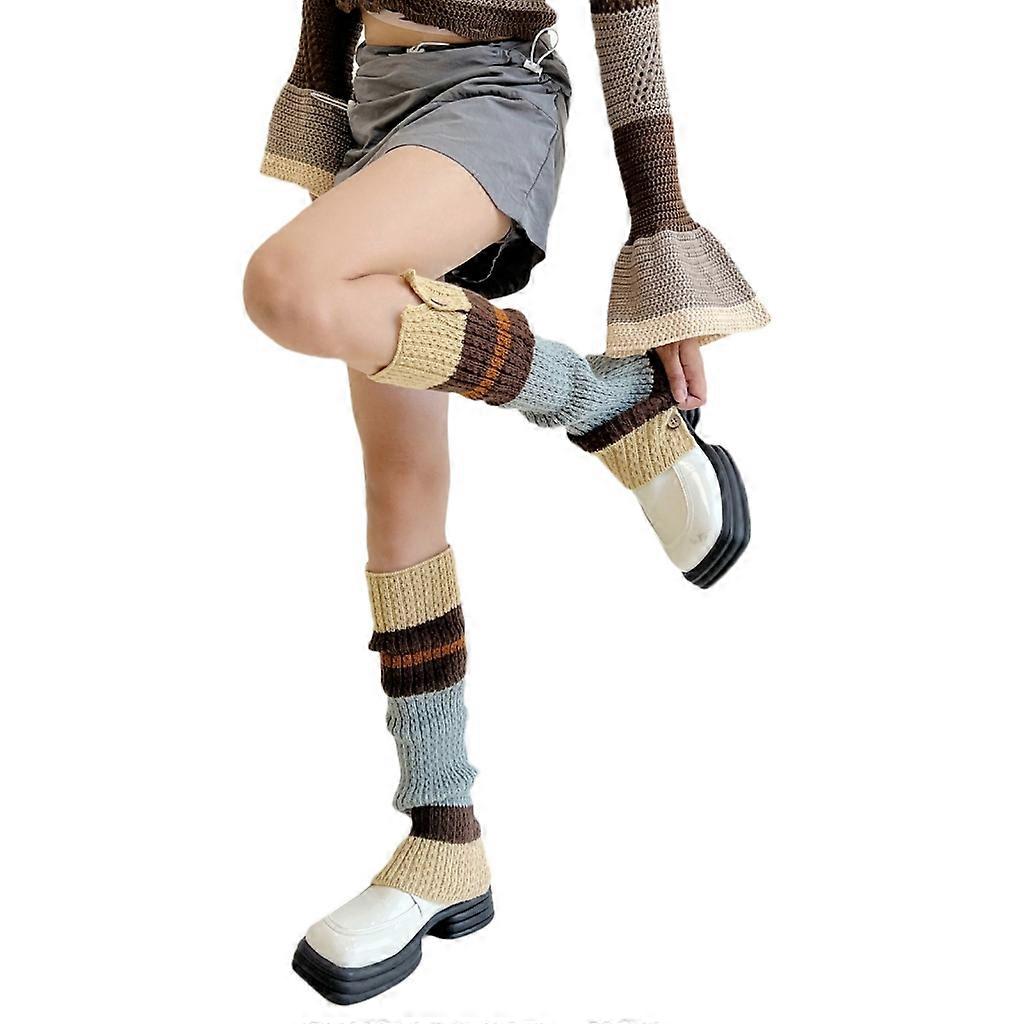 Women Student Leg Warmers Knitted Button Up Contrast Color Striped Calf Socks