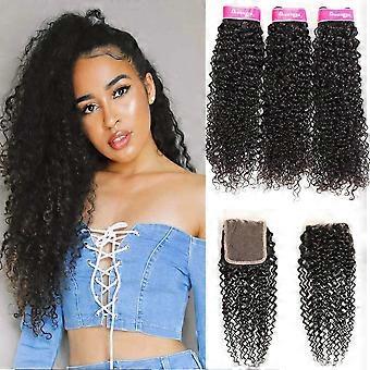Mongolische Echthaar-Extensions mit krausen Wellen und 4x4 Lace Closure, Naturschwarz