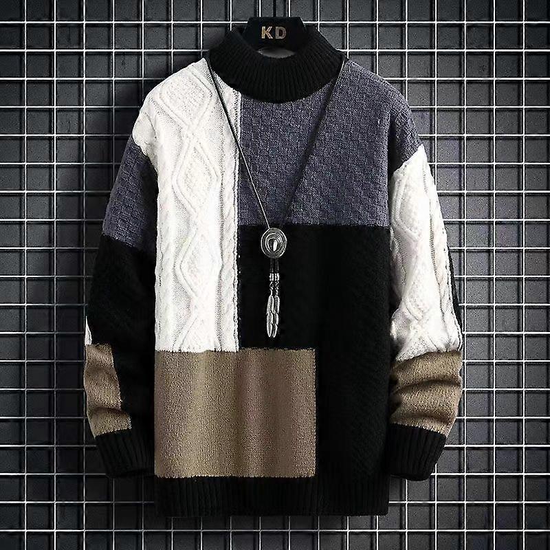 Autumn Winter Men Casual Sweater Warm Stitching Color Matching Pullover Round Neck Sweater Thickened Knitted Sweater