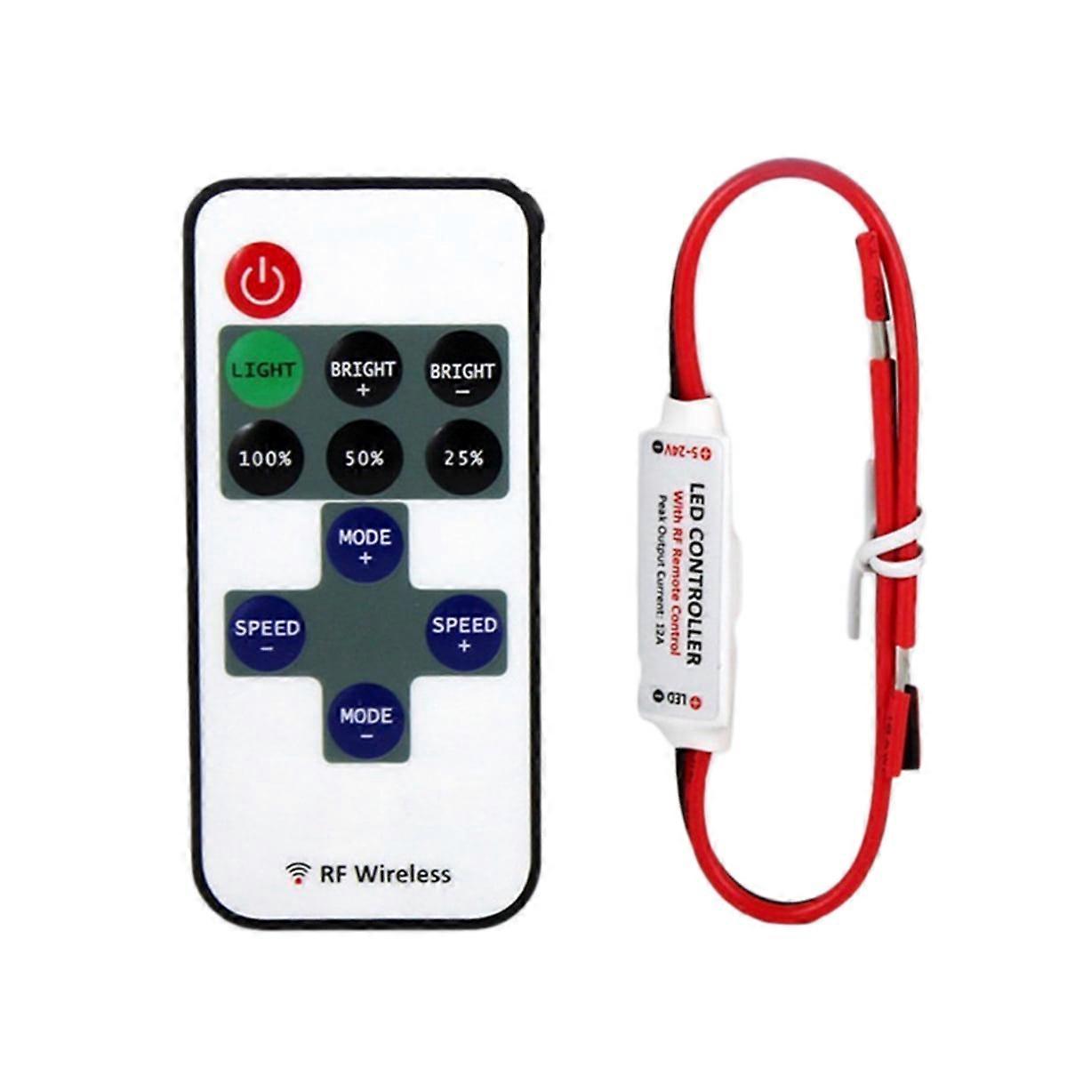 Description With advanced computer control chip, and RF wireless signal control, this 11 keys led controller can be used to control the brightness of monochromatic LED strips. It can achieve a single static ten - level brightness adjustment, 8 monochrome dynamic mode, and has burst flash, breath, dimmed, flicker, and other patterns, and there are 10 levels. controller with large span, easy to carry, easy to use. Feature - RF led dimmer can control brightness of led strip, flashing, and flashing mode - Mini RF Remote Controller for 5050 3528 5630 3014 Single Color LED Strip Lights - RF controller is able to pass through battier and gets a long controlling distance and controlling range, you don't have to point the remote to the receptor as you did with IR remote. Specification: - Color: As shown - Material: Plastic and metal - Size: 42 x 12 x 5mm - Size: 86 x 40 x 7mm - Working Temperature: -20-60℃ - Power: 12V~24V - Strip length: 90mm - The connection mode: common anode - Maximum Load Current: <6A - Output Power: 12V