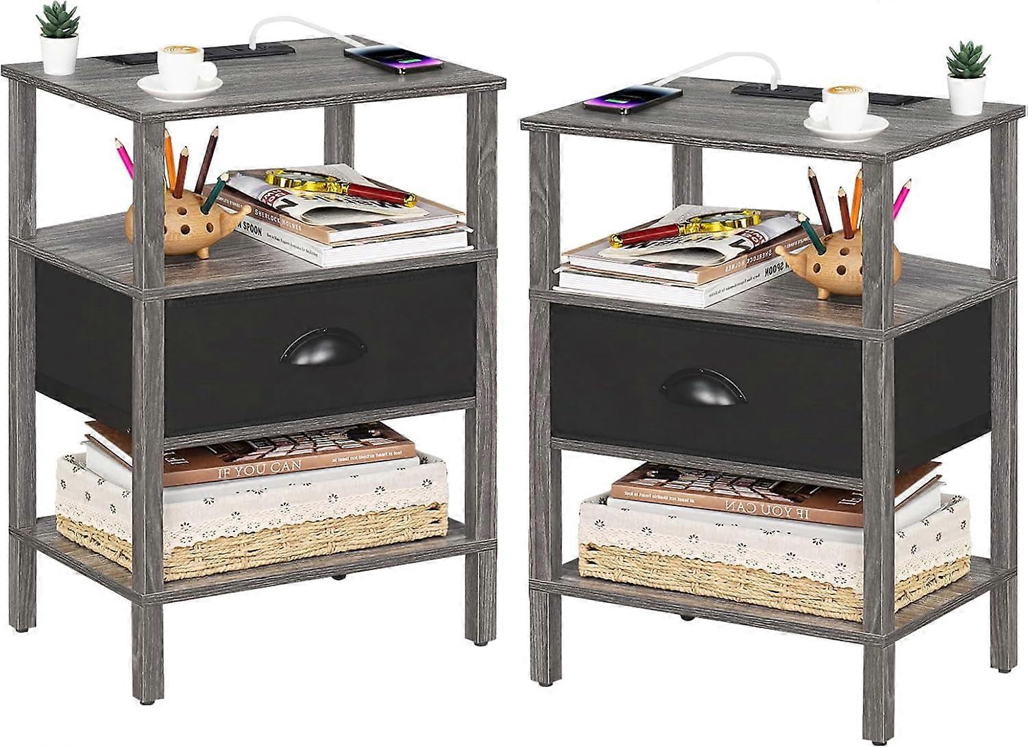 Lerliuo Nightstand Set of 2 with Charging Station & USB Ports, 3-Tier Storage End Table with Cloth Drawer, for Bedroom, Living Room - Grey