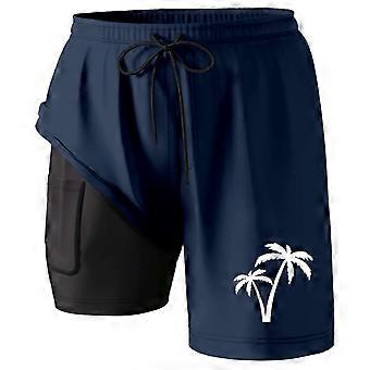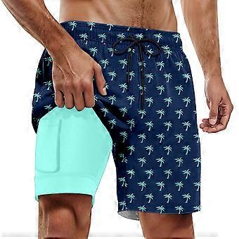 2-in-1-Laufshorts für Herren, schnelltrocknend mit Innenfutter, sommerliche Strandshorts mit Kokosnussbaum-Print, Kordelzug und Taschen, bequeme Hose