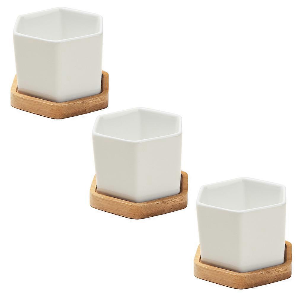 Mini Ceramic Planter Cactus Planter Pot with Bamboo Tray for Study Room Tabletop Decorative Use 3 Sets