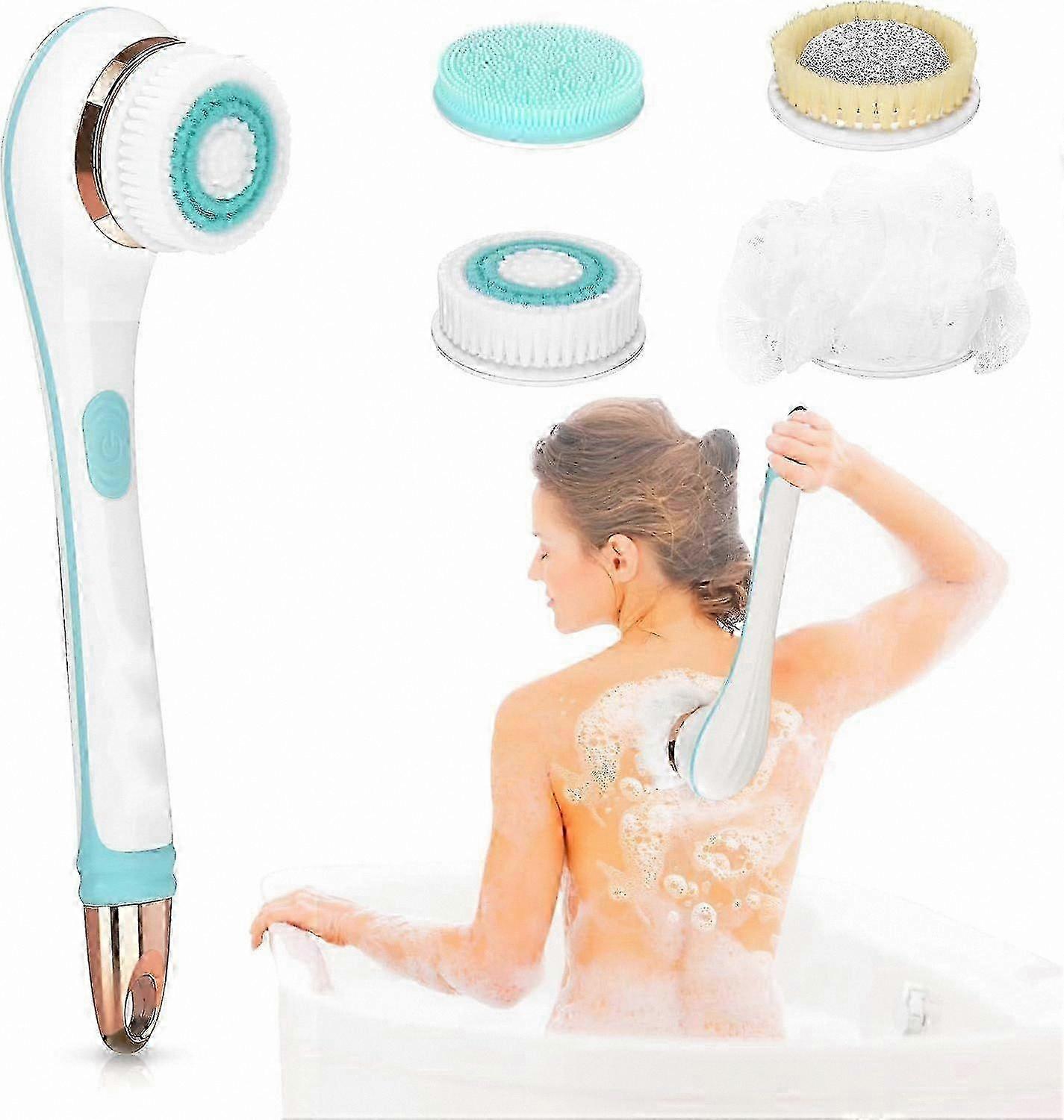 Rechargeable Exfoliating Brush with Long Handle, 4 Interchangeable Heads for Body and Face Cleansing Massage Kit