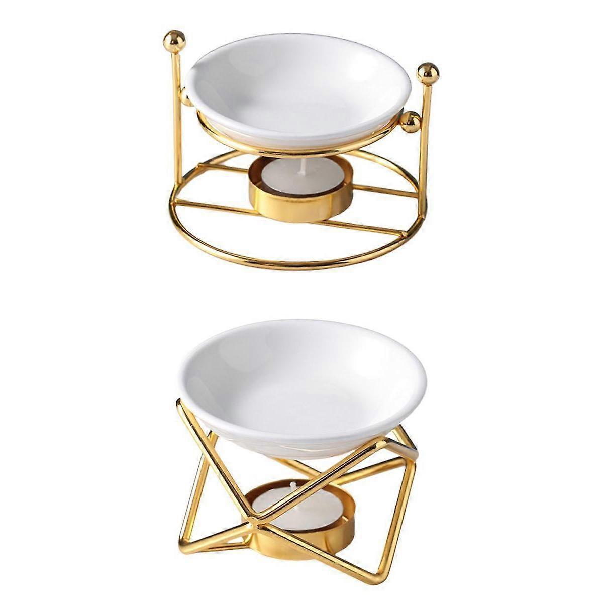 Description: Multifunction & Wide Application: Can be used as a diffuser, burner, and great decoration for living room, bedroom, balcony, patio, porch & garden. Dimension: White dish diameter: 10.3cm/4.06inch, essential oil and candle are not included. Capacity is 50ML. Easy To Use: Poured water into the bowl about 2/3 and then 4 - 6 drops of the oil into the bowl, Put the candle into the candle holder and light the candle below. The tea light warms up the essential oils/ wax in ceramic saucer to diffuse aromas and fragrance. Split aroma lamp design make it easy for cleaning and the 50ml large capacity bowl can make the burning time of essential oil / wax last longer. Geometric rack design, elegant, beautiful, a perfect home decor, which creates a romantic atmosphere for your room. Specification: Material: Metal + Ceramic Size: W x H Approx. 9x7.3cm/3.54x2.87inch Size: W x H Approx. 13x8cm/5.12x3.15inch Package Includes: 2 Pieces Oil Burner (Gold) Note: Color might be slightly different due to the color calibration of each individual monitor. Please allow slightly measuring deviation due to manual measurement.