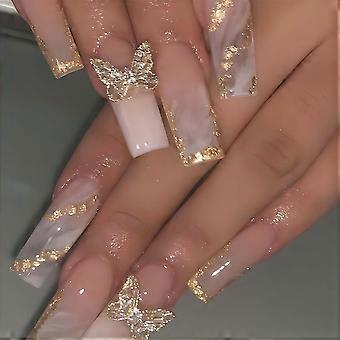 Glänzende Ombré-Sargform-Kunstnägel, 24 Stück, mit 3D-Schmetterling und goldenem Glitzer-Acryl-Finish