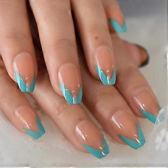 Kurze Ballerina-Press-On-Nägel, blaue French-Tip-Form mit glänzend silbernem Rand, 24 Stück, langanhaltendes Gel